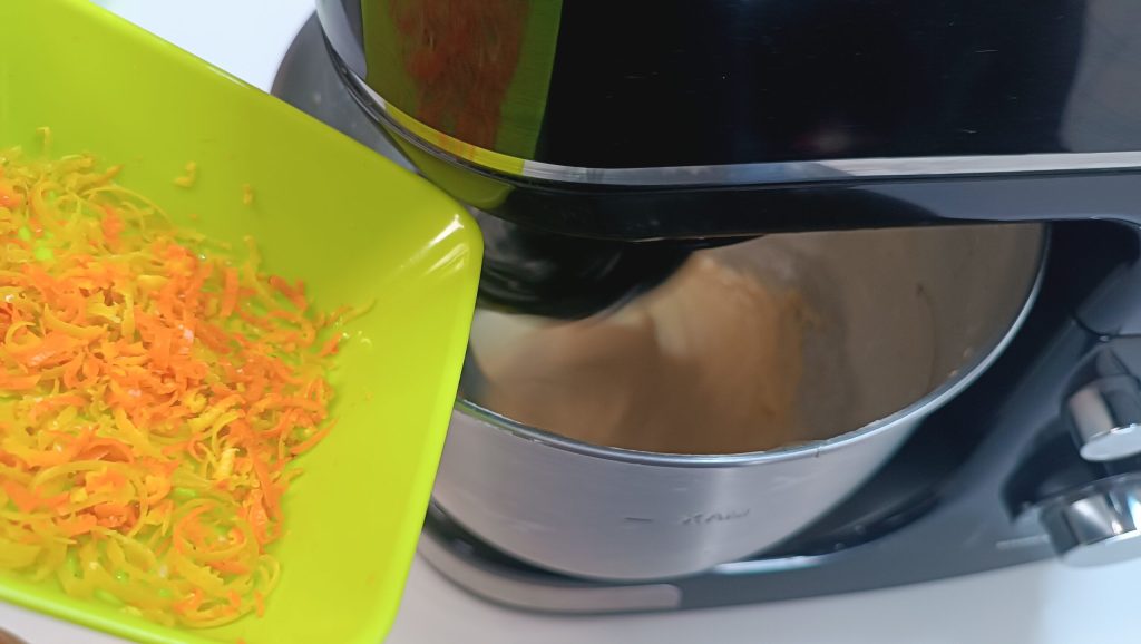 • Als het deeg is ingeklonken, voeg je de aroma’s toe: het vanille-extract en de citrusrasp.