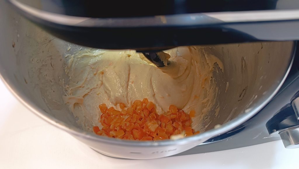 • Als alle boter is opgenomen, voeg je de gekonfijte vruchten of chocoladedruppels toe