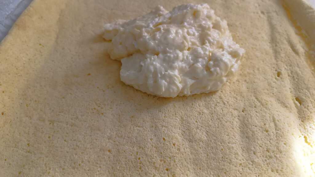 Rol het biscuitdeeg uit en voeg de room toe, waarbij de randen vrij blijven.