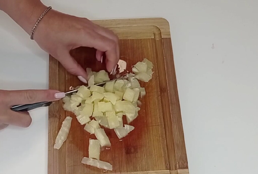 Snijd de ananas in blokjes en laat er een paar apart voor de garnering