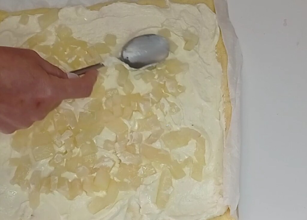 Met zijn zachte textuur en frisse, omhullende vulling combineert dit dessert de lichtheid van het biscuitdeeg met de zoetheid van ananas en de romigheid van de vulling.