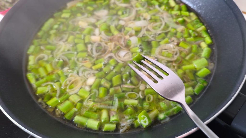 • Bak de sjalot in een pan met een beetje olie en laat ook de gesneden asperges meebakken.