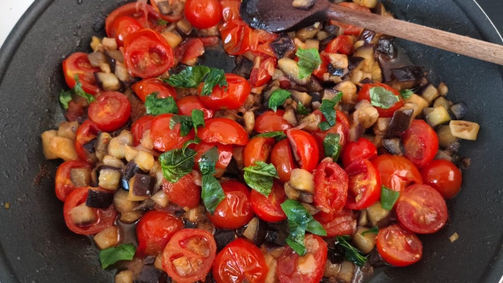 Kook de aubergines 10 minuten en voeg dan de gesneden cherrytomaten toe.