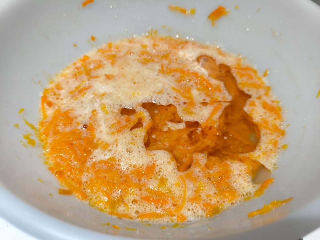 In een grote kom klop je de eieren met de suiker (of erythritol) tot een lichte en schuimige massa. Voeg de pompoenpuree en geraspte wortels toe en meng goed.