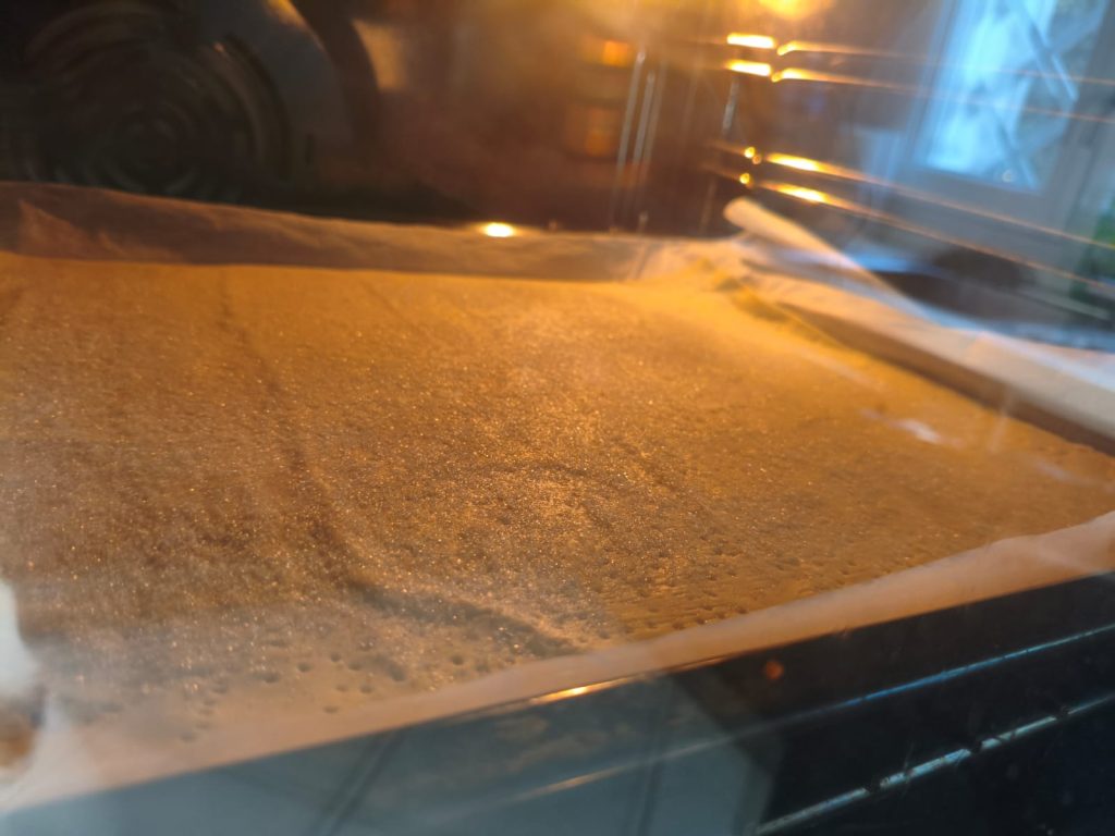 Rol het bladerdeeg uit, prik het met een vork en bestrooi het met suiker of erythritol.