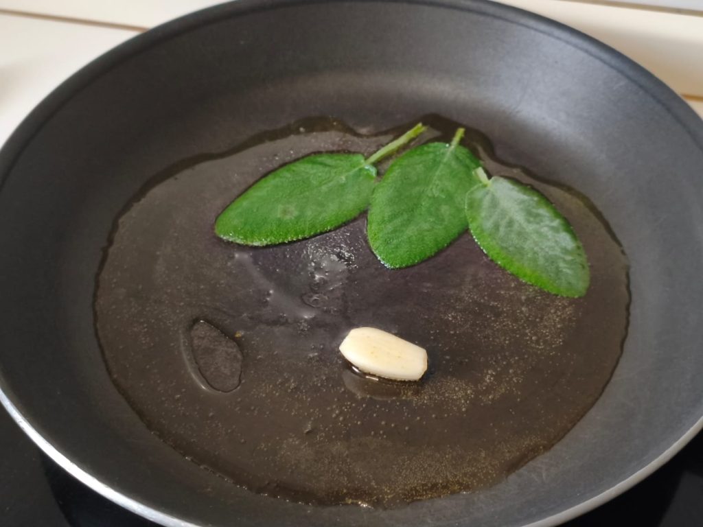 Doe in een pan de salie en een teentje knoflook bij de olie en laat het smaak krijgen. Voeg in blokjes gesneden pompoen toe. Breng op smaak met zout. Kook het en voeg indien nodig een beetje water toe.