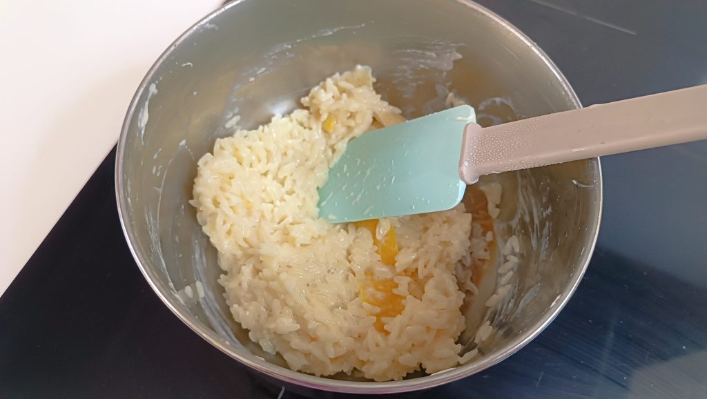 Voeg de gekookte rijst toe en meng totdat je een homogeen en zacht mengsel hebt.