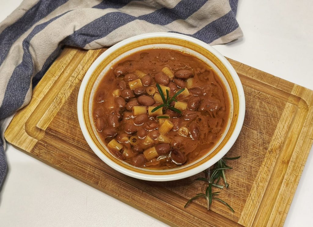 Je begint met het fruiten van de sjalot in een pan met een takje rozemarijn, wat een heerlijke geur geeft. Vervolgens voeg je de tomaat toe, vers of gepureerd, en laat je het op smaak komen. Ondertussen pureer je de helft van de reeds gekookte bonen om een romige saus te krijgen. Deze saus voeg je toe aan de tomaat samen met de groentebouillon en breng je alles aan de kook. Op dit punt voeg je de pasta toe, welke je maar wilt: elleboogjes, kleine buisjes of zelfs gebroken pasta. Wanneer de pasta bijna gaar is, voeg je de overige hele bonen toe en maak je het af met een scheutje extra vierge olijfolie.