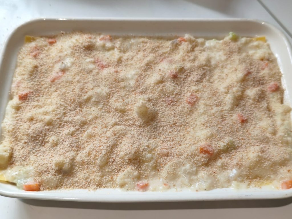 Eenmaal gecombineerd met bloemkool en bechamel, heb ik de lagen samengesteld zoals bij traditionele lasagne. Tot slot, een royale strooiing van paneermeel op het oppervlak om die gouden korst te creëren waar iedereen dol op is 😍.