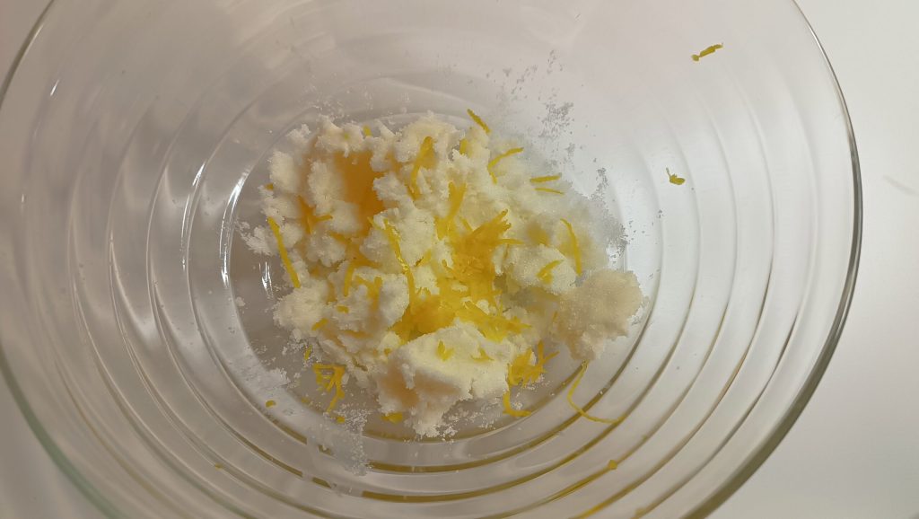 Begin met het maken van de zanddeeg: doe de zachte boter met de suiker en de citroenschil in een kom