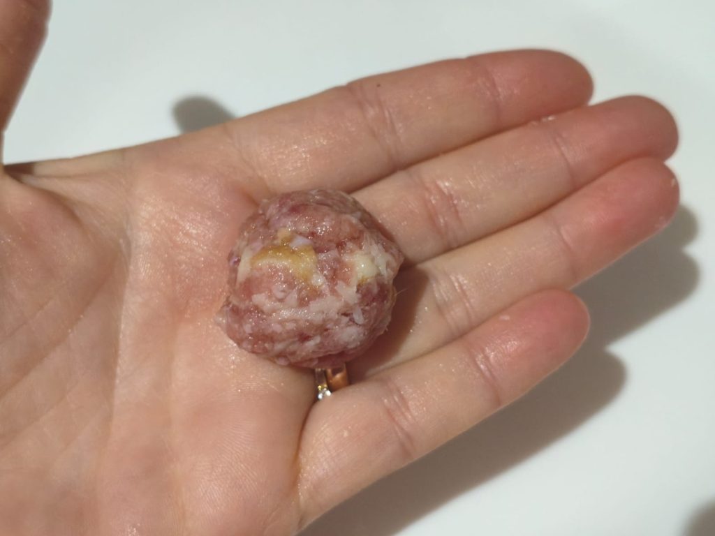 • Vorm kleine gehaktballen door je handen vochtig te maken.
