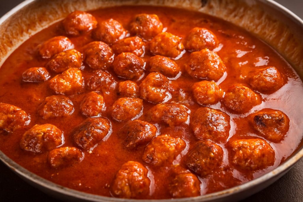 Eeen lange kooktijd is niet nodig: 20-30 minuten zijn voldoende om een rijke en geurige saus te krijgen. De gehaktballen geven smaak af tijdens het sudderen.