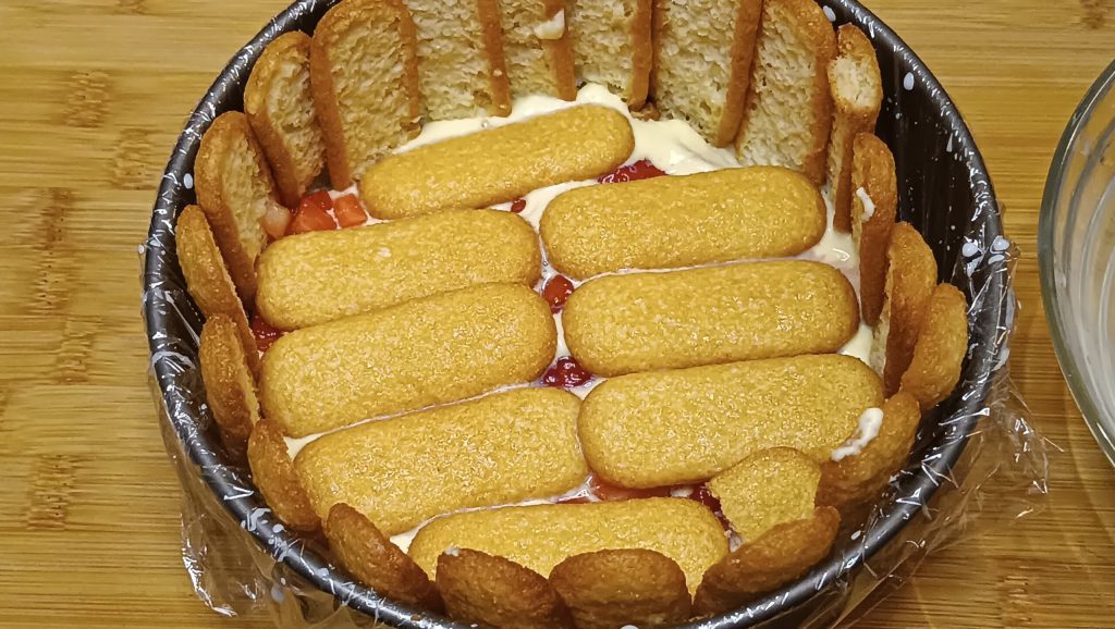 Leg de crème en aardbeien op de koekjesbasis en leg er meer koekjes op tot het dessert voltooid is