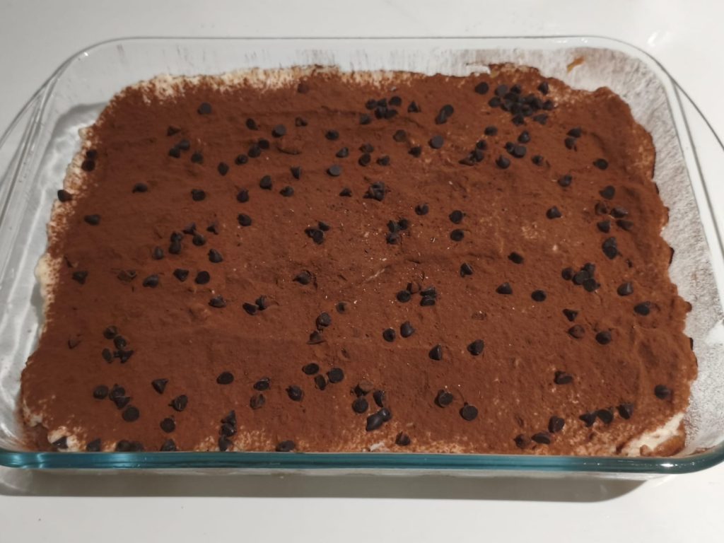 Maak in een ovenschaal een eerste laag ricottacrème, voeg de chocoladedruppels toe en maak een laag van snel in koffie gedoopte savoiardi (doop ze niet te lang).