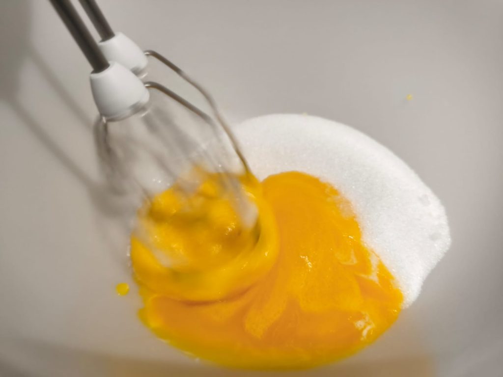 Klop de eidooiers met de erythritol in een andere kom tot ze licht en schuimig zijn.