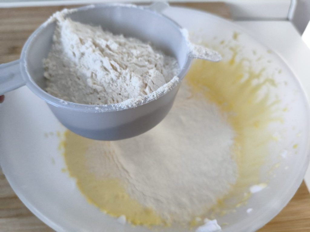 Voeg gezeefde bloem en bakpoeder toe en meng voorzichtig.