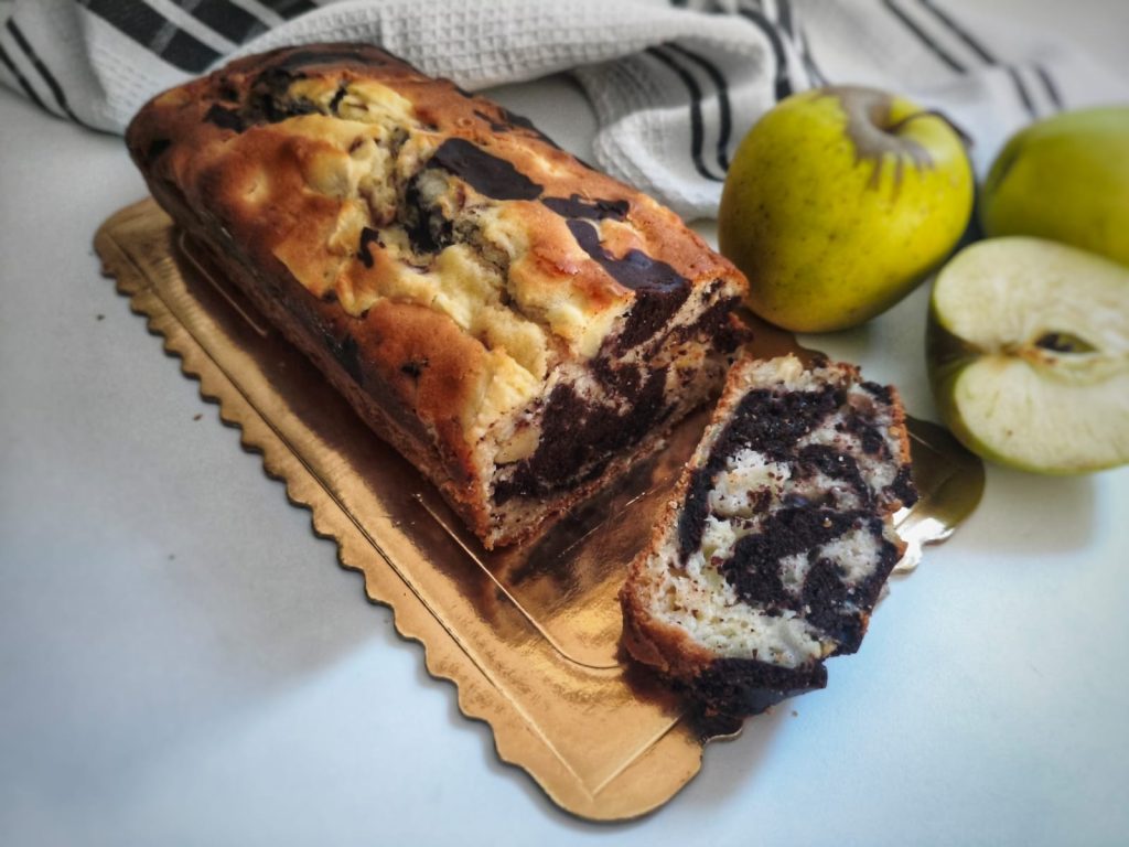 Na een statische ovenbak van 180°C gedurende 30 minuten, is het resultaat een gemarmerde caketaart met cacao en appels die zacht, vochtig en onweerstaanbaar is.