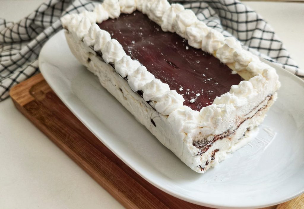 Om het te maken klop ik de goed koude slagroom met de suiker, voeg dan voorzichtig de stijfgeklopte eiwitten toe. Ondertussen smelt ik de pure chocolade en laat het afkoelen. Dan wissel ik lagen room en gesmolten chocolade af in een met folie beklede cakevorm. De chocolade vormt, eenmaal afgekoeld, dat dunne en knapperige korstje dat elke plak bijzonder maakt. Na een paar uur in de koelkast is het klaar om te snijden, mooi en golvend net zoals het origineel. Een mooi dessert met slagroom en chocolade! 😀