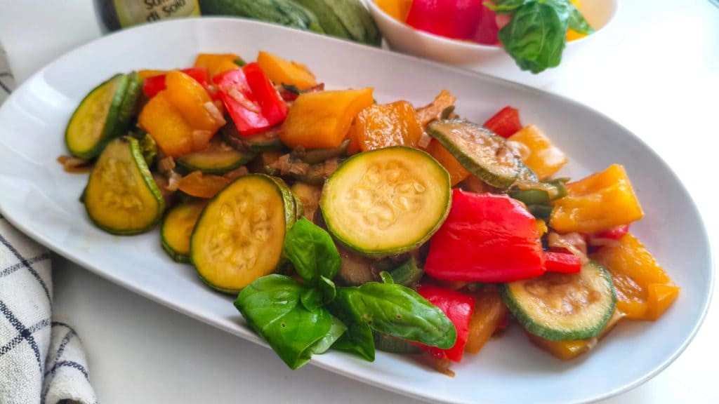 De mix van smaken is geweldig: de zoetheid van de groenten past perfect bij de zoute toets van de sojasaus, wat een perfecte balans creëert. Bovendien is het een veganistisch recept, licht maar vol van smaak, ideaal als je op zoek bent naar een idee voor een smaakvol zomers bijgerecht of iets anders op tafel wilt brengen dan normaal.