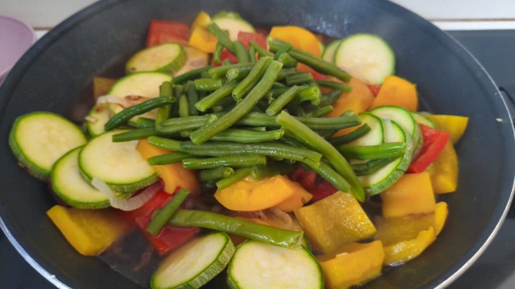 Ik maak ze zo: ik snijd paprika, courgettes en verse sperziebonen in stukjes, voeg een dun gesneden ui toe en doe alles in de pan met een scheutje water en veel sojasaus. Geen gedoe, alles in een paar stappen: een echt snel en gezond zomers recept.