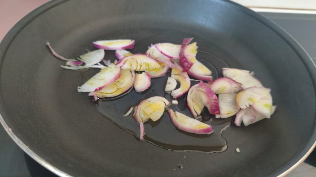 Bakken op hoog vuur en op smaak brengen met basilicum en een beetje zout.