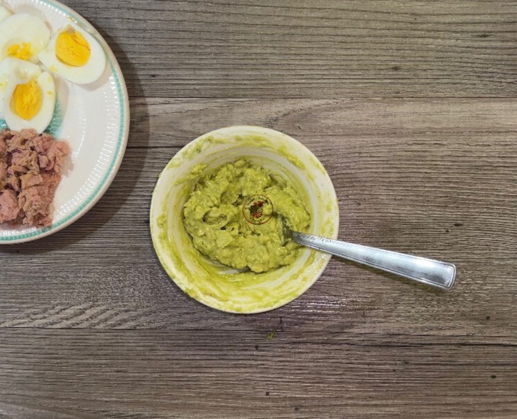 In een kom, prak een halve avocado met een vork. Voeg olie, zout en peper toe.