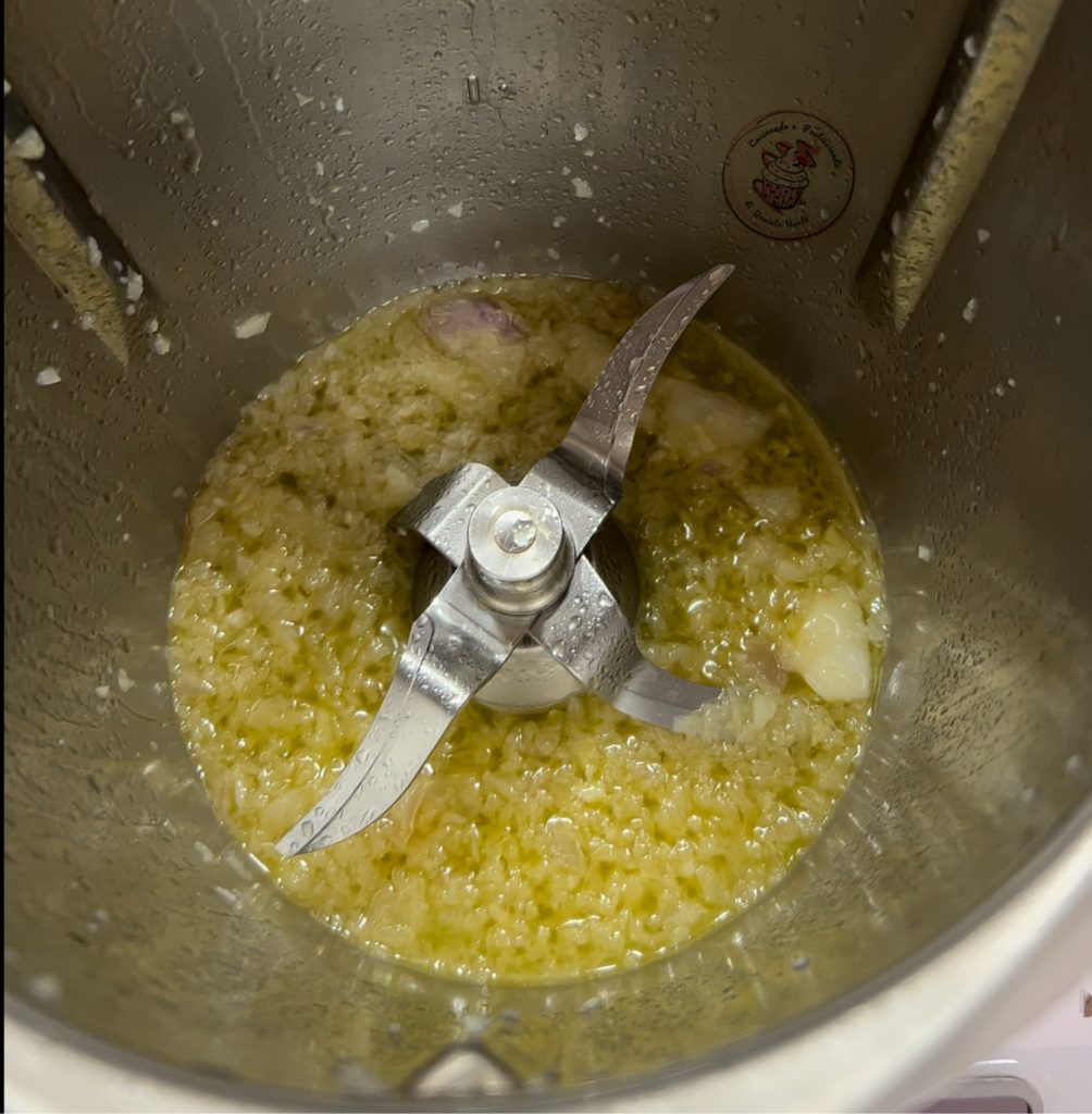 Doe de extra vergine olijfolie, de ui en het knoflookteentje in de beker. Hak fijn: 5 sec./snelheid 5. Verzamel op de bodem met de spatel en breng op smaak met de mand in plaats van het maatbekertje: 3 min./120°C/snelheid 1.