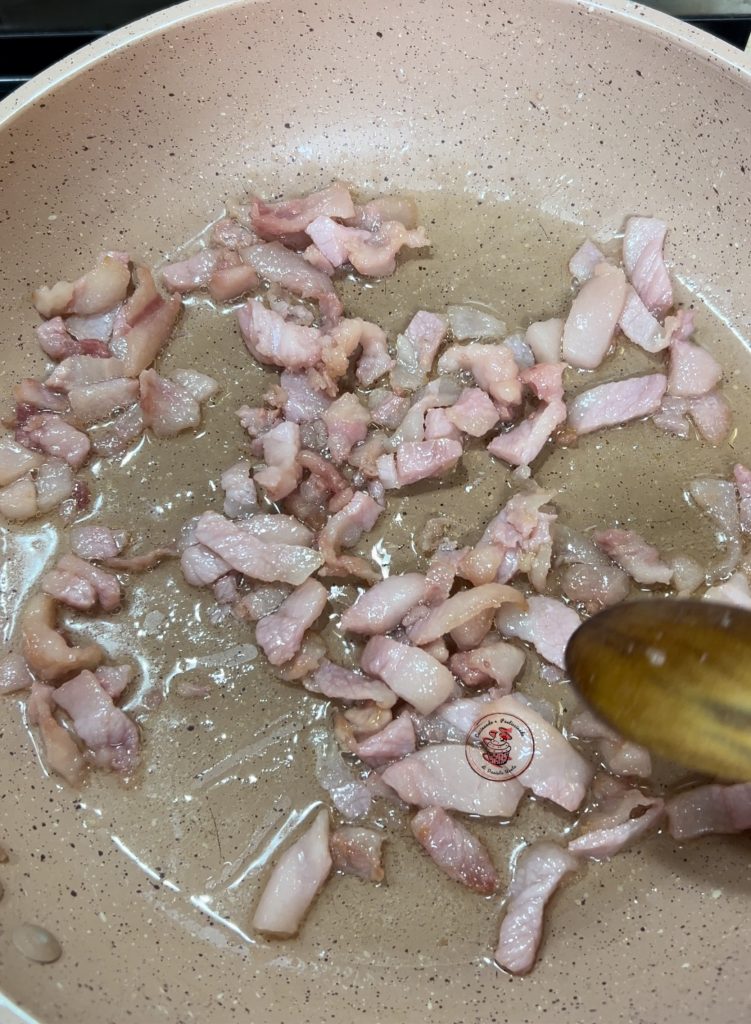 Bak de guanciale in de koekenpan een paar minuten, totdat het mooi goudbruin is. Gebruik geen olie.