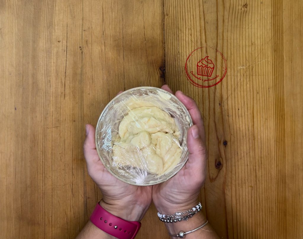 Het eerste wat we moeten bereiden is het aroma. In een kom plaatsen we de zachte boter (ik raad aan om het een paar uur op kamertemperatuur te laten), pandoro-aroma en vanille. Meng tot een homogene crème, bedek met plasticfolie en zet opzij.