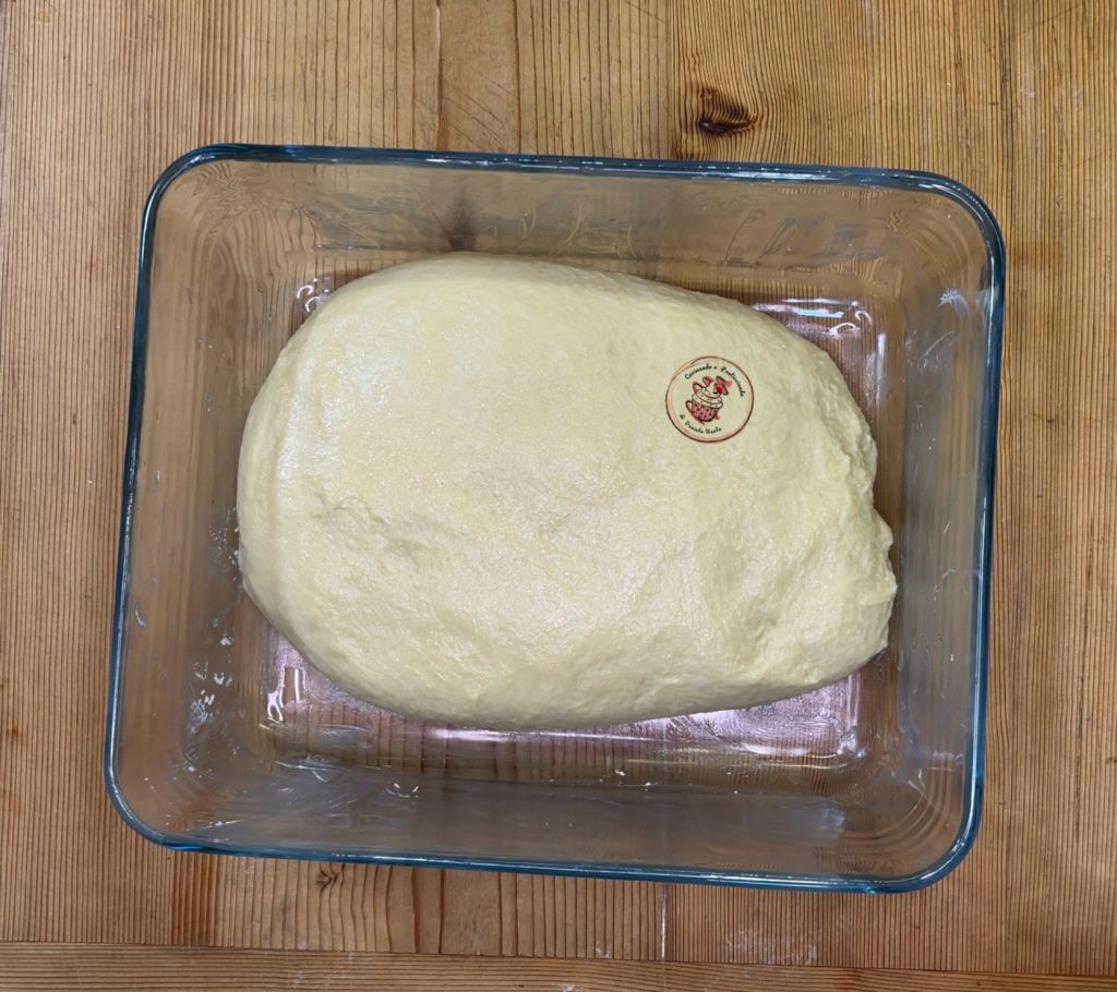 In een kom lossen we het moederdeeg op met de melk en suiker, voegen we het meel toe en vormen een klontvrije pap die we ongeveer 1 uur laten rusten, bedekt met plasticfolie. Het moet verdubbelen.