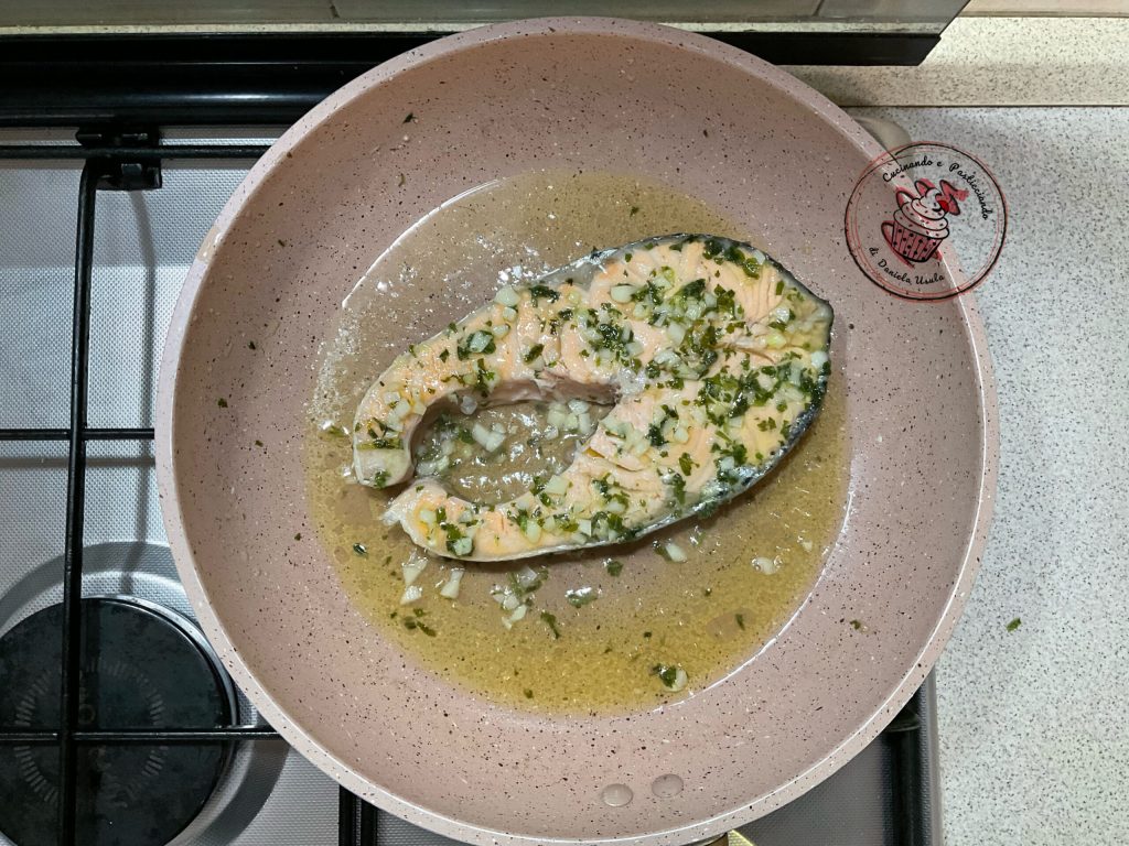 • Bak de zalm met de gehakte knoflook en peterselie in een pan gedurende ongeveer 5 minuten aan elke kant.