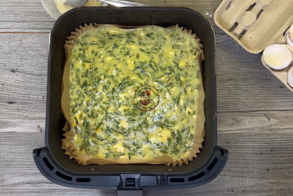 Bekleed de mand van de airfryer met bakpapier en giet het eimengsel erin.