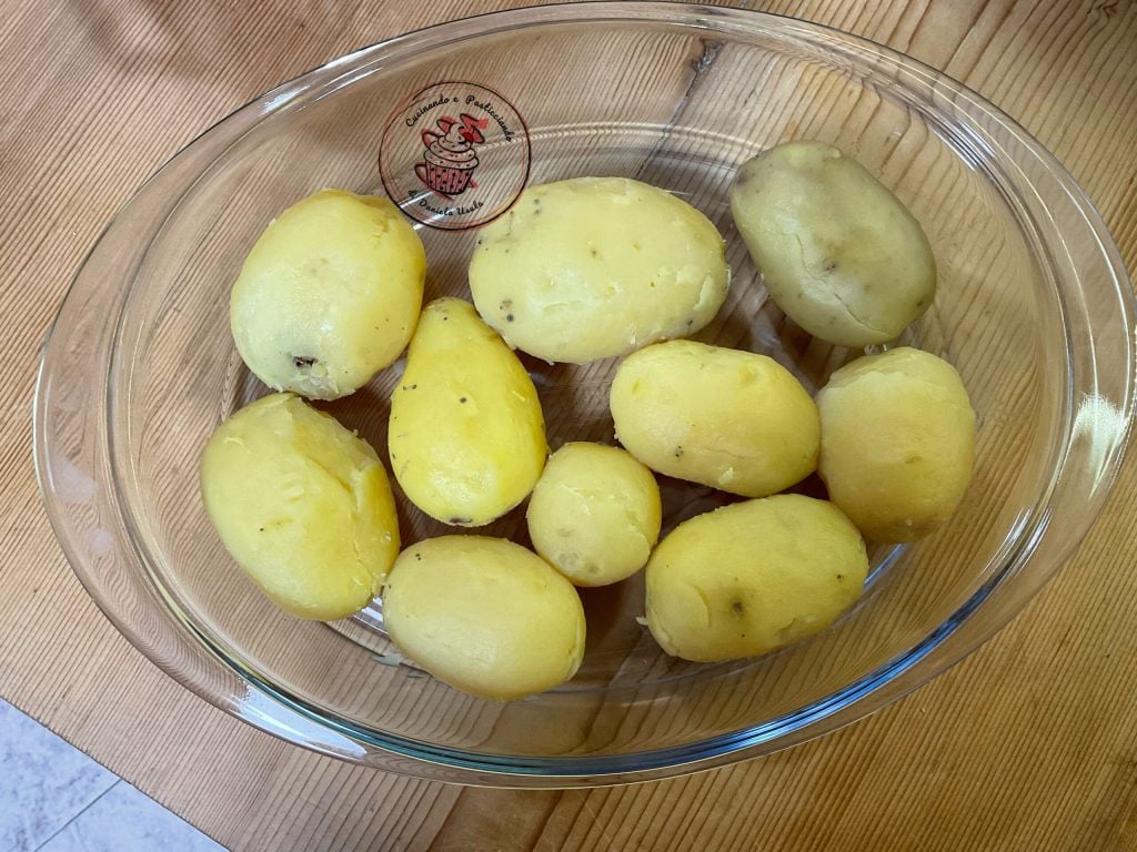 Kook de aardappelen apart en verwijder de schil.