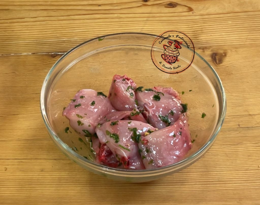 • Doe het in stukken gesneden konijn in de kom, voeg de gehakte knoflook en peterselie met de olie toe en meng. Laat ongeveer 1 uur rusten.