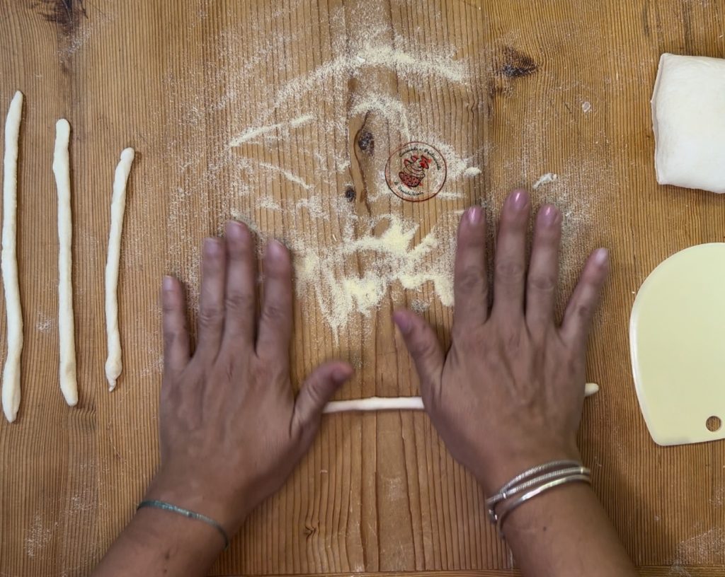 Van deze kleine stukjes deeg maak je de grissini. Rol ze met de handen.