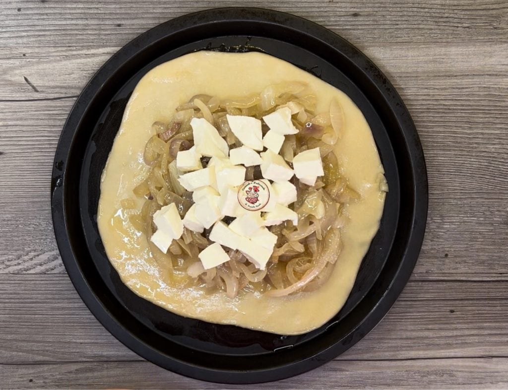 Ik heb het deeg overgebracht naar de met olie ingevette bakplaat en de uien en in blokjes gesneden mozzarella toegevoegd.