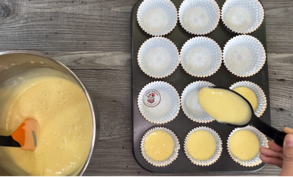 Bekleed de muffinvorm met papieren vormpjes en vul ze voor 2/3. Bak ze ongeveer 20 minuten op 180°.
