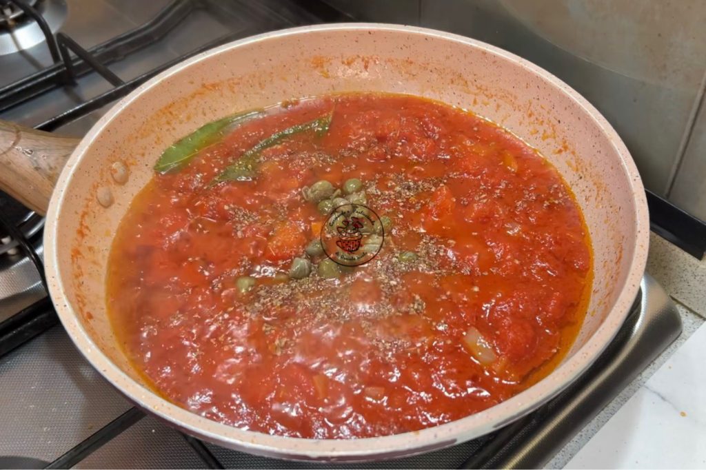 Voeg de tomaat, het laurier, de oregano en een paar kappertjes toe. Breng op smaak met zout en laat ongeveer 10 minuten zachtjes koken.