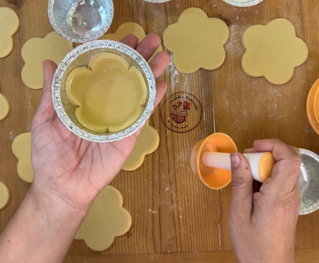 Neem het korstdeeg, rol het uit op een met bloem bestoven werkvlak, en gebruik een geschikte vorm om de mandjes uit te steken en plaats ze op de bakvormpjes.