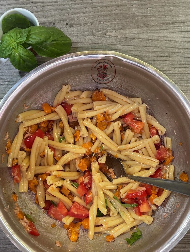 Als je op zoek bent naar een fris, kleurrijk en smaakvol hoofdgerecht, dan is deze koude pasta met tonijn, geroosterde pompoen en tomaatjes perfect! Ideaal voor de zomer, het kan van tevoren worden bereid en iedereen aan tafel zal er dol op zijn, zelfs tijdens picknicks of lunches op het strand. Een uitgebalanceerde mix van de zoetheid van pompoen, de frisheid van tomaat en de hartigheid van tonijn… zeker het proberen waard!