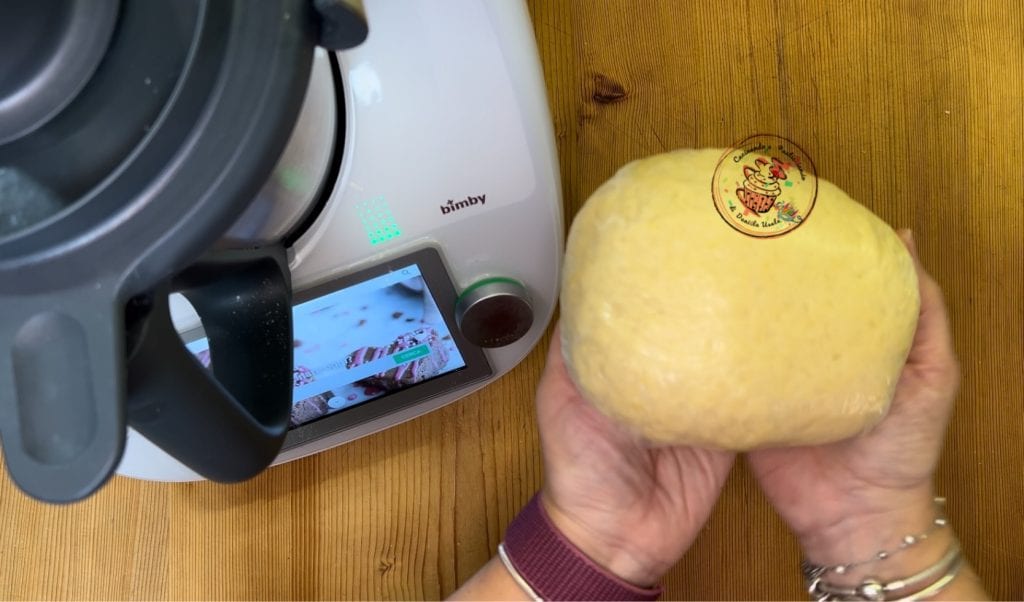 • Giet alle ingrediënten, behalve de wijn, in de kom van de deegmachine. Gebruik voor dit deeg het bladerdeeg. Begin met kneden en voeg langzaam de wijn toe. Wanneer het deeg loskomt van de wanden is het klaar. Haal het uit de kom, vorm een bal en wikkel het in plasticfolie. Ga daarna verder zoals hierboven beschreven.