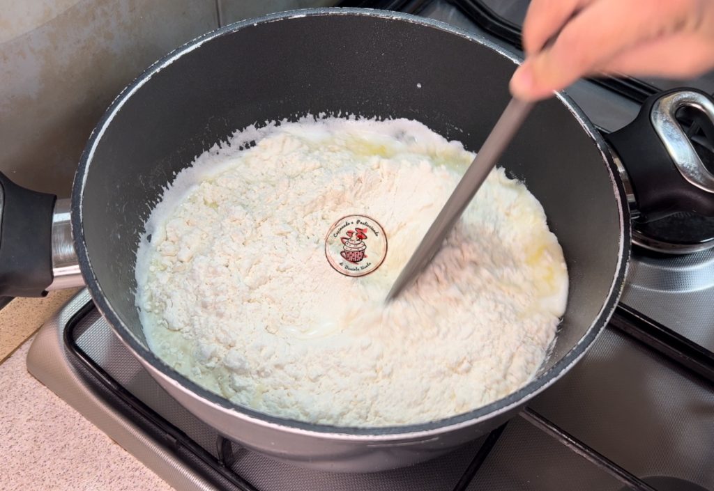 Als de boter gesmolten is, zet het vuur uit, voeg de bloem toe en roer totdat de melk alle bloem heeft opgenomen.