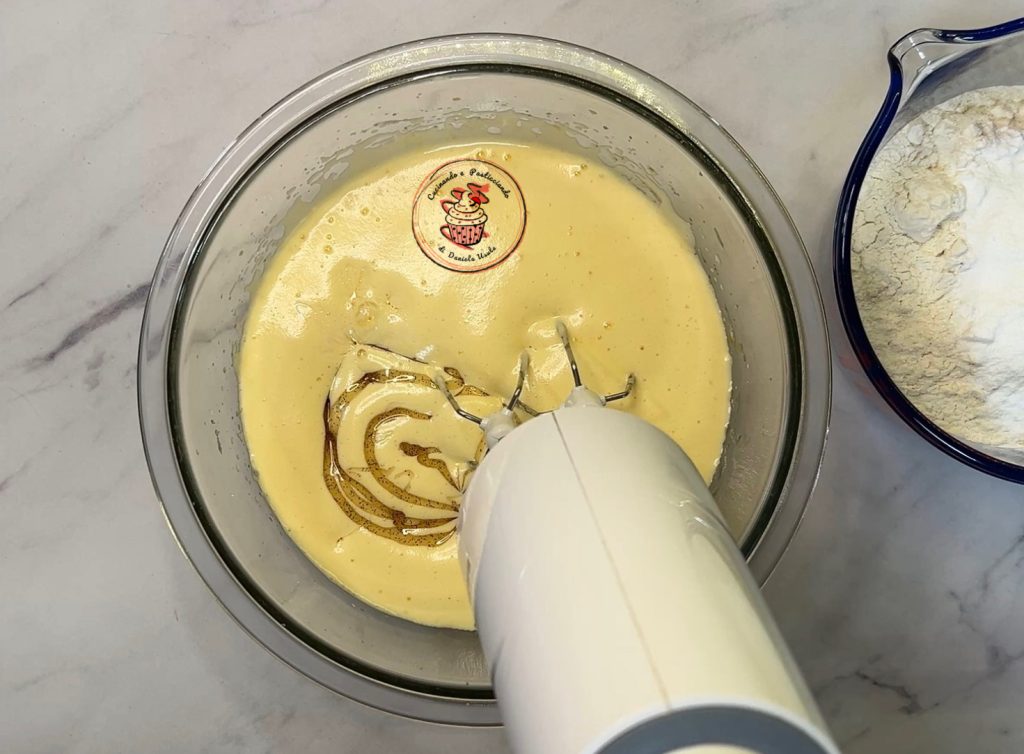 Meng het bakpoeder met het meel en voeg de droge ingrediënten toe aan het eimengsel. Mix een paar minuten tot het beslag glad is en zonder klontjes.
