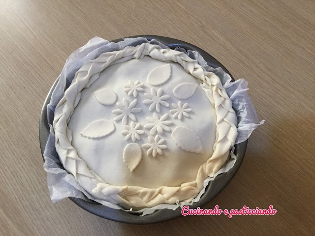 Dek af met de tweede deegcirkel en gebruik de deegresten om de bovenkant van de taart te versieren. Bak ongeveer 40 minuten op 180°C.