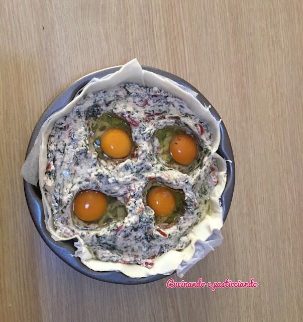 Bekleed de bakvorm met de eerste deegcirkel, zonder het bakpapier te verwijderen. Leg de ricottavulling erin, maak 4 gaten met een lepel en plaats in elk gat een ei.