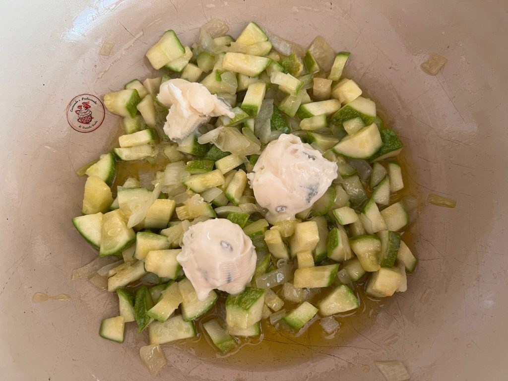 Snijd de courgette in stukjes en bak deze ongeveer 10 minuten met olie en zout samen met de gesnipperde ui.