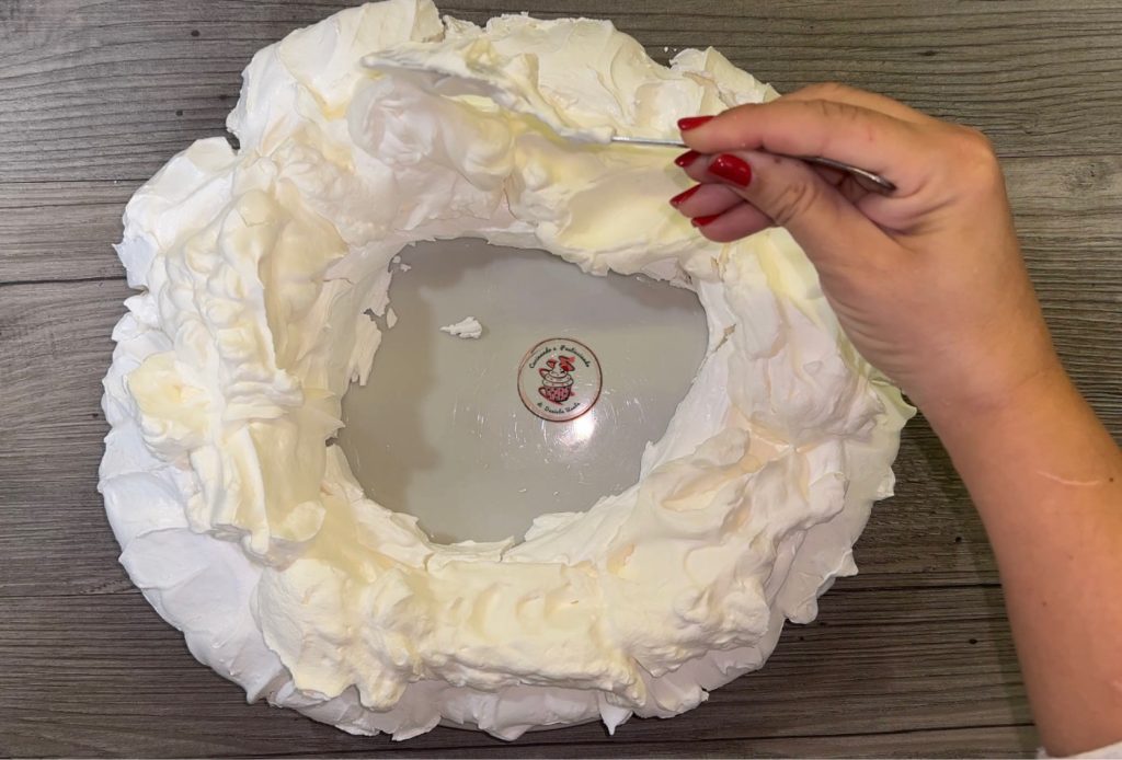 Plaats de pavlova op een serveerschaal en vul deze met de slagroom.