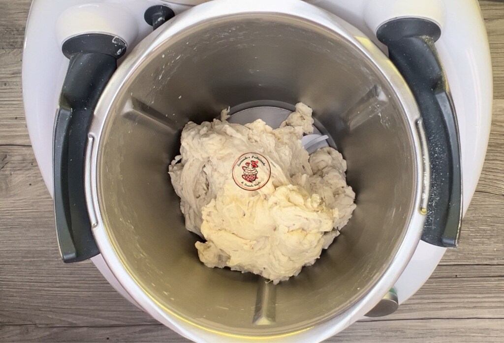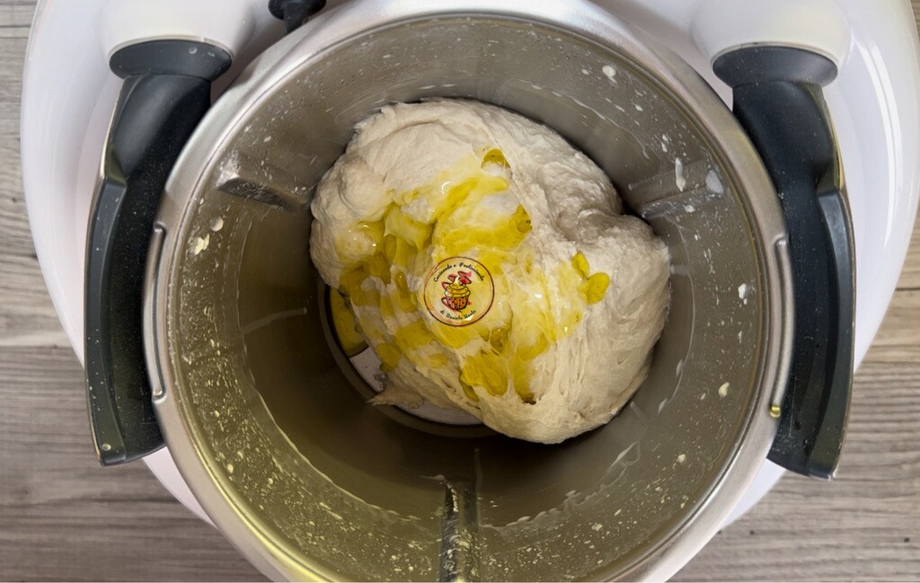 • Voeg de olie toe en kneed nog 2 minuten op spiraalsnelheid.
