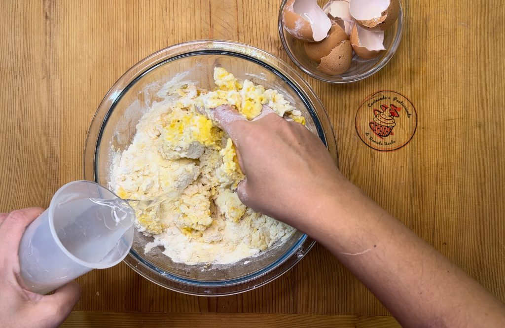 Doe de bloem en het griesmeel in een kom, voeg de eieren toe en kneed terwijl je geleidelijk water toevoegt.