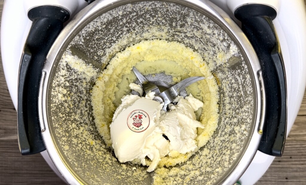 Zonder de mengkom schoon te maken, doe de citroenschil en de suiker erin en maal 20 seconden op snelheid 10. Voeg de ricotta en de likeur toe en werk 20 seconden op snelheid 4.